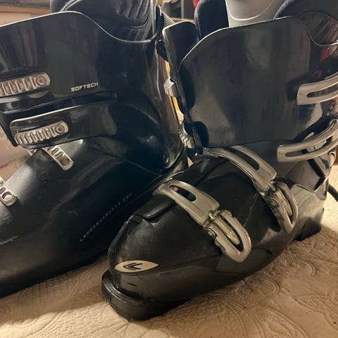 Støvlene er svarte og har fire spenner for justering. Lite brukt.