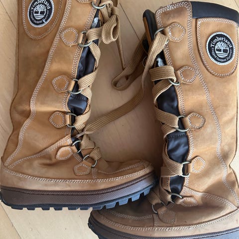 Timberland Mukluk vinterstøvler i størrelse 36/37 (5.5) med okerfarge. Støvlene har snøring foran og en solid gummisåle for godt grep. Innvendig fôret med mykt materiale for varme og komfort.