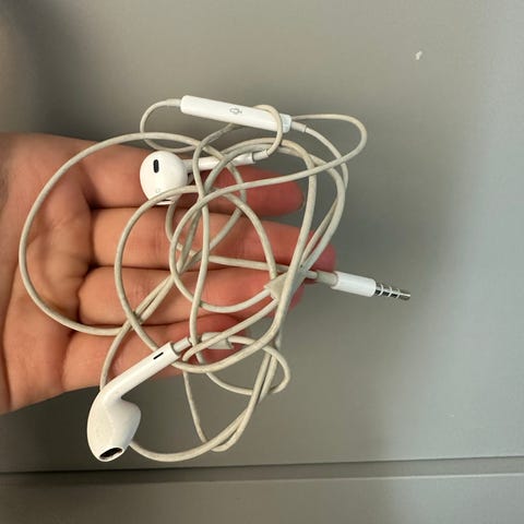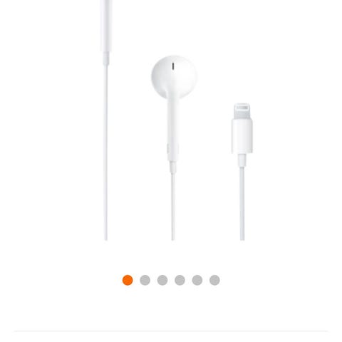 Apple hodetelefoner med Lightning-kontakt i hvit farge. Leveres med ledning og er beregnet for bruk med enheter som støtter Lightning-tilkobling.