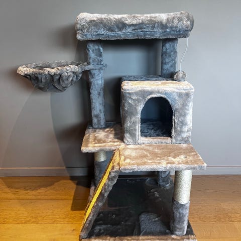Klorestativet til pusen er kledd i lyst ribbet stoff med grå canvaskanter. Kloretårnet har flere platåer, og her finner du klorestenger surret i sisal, og små leker som henger i snorer.