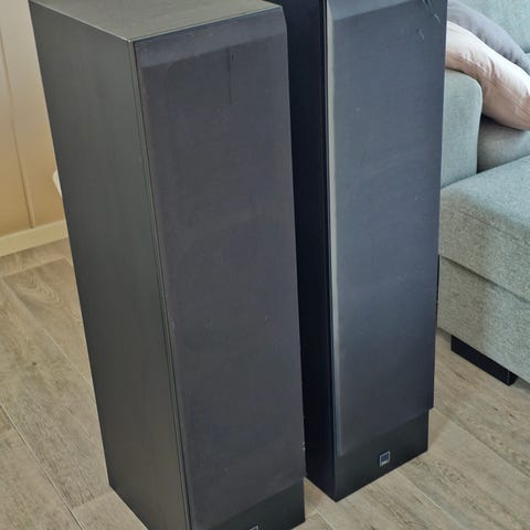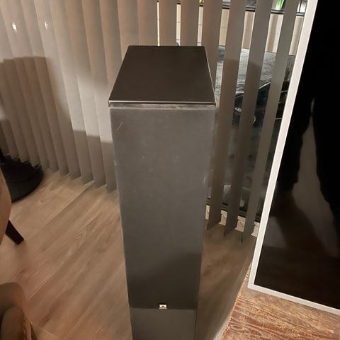JBL MK 1000 gulvhøyttaler med svart finish. Høyttaleren har flere drivere for lydgjengivelse og tilkobling bak på enheten. Designet for bruk i hjemmekino eller musikkavspilling.
