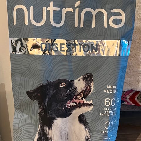 Nutrima Digestion hundefôr. Inneholder en ny oppskrift med fokus på fordøyelse. Egnet for hunder, med 60 % animalske ingredienser og 31 % proteininnhold. Åpnet og brukt ca 200gram