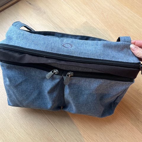 # Svart Veske til å feste bak vognen. Inkluderer base med hjul og fester til vogn. Lite brukt til 500,-kr