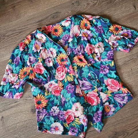Pen bluse fra 60-tallet. Pen krage, stoffknapper og mansjetter. Liten skade på venstre framside, høyre skulder bak og et bittelite hull på høyre arm. (Se bilder med piler på) En knapp er borte men det sitter reserveknapp på innsiden. Stoffet er antagelig polyester.