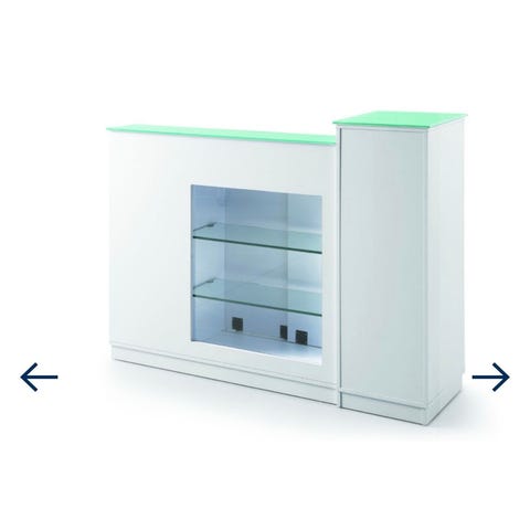 Resepsjonsdisk med svart frontpanel i polstret design og hvit bakside. Diskens overflate er svart og glanset. Bakdelen har flere åpne hyller for oppbevaring. Passer til bruk i resepsjoner eller som informasjonsdisk.