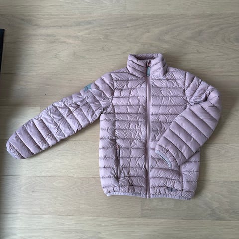 The North Face dunjakke i størrelse 134 for jente. Jakken er lilla og laget med dun som isolasjonsmateriale, egnet for kalde værforhold.