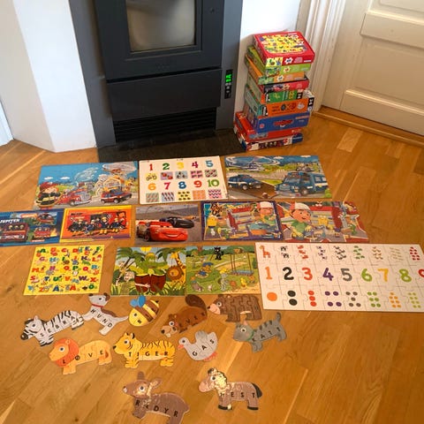 Fotokort barnepuslespill med 18 kort som viser ulike dyremotiver og figurer. Kortene er laget for små barn og kan brukes til å lære om dyr og figurer gjennom lek og matching. Inneholder puslespill med ku, gris, hest, høne, katt, jente, hund, og kjente tegneseriefigurer.
