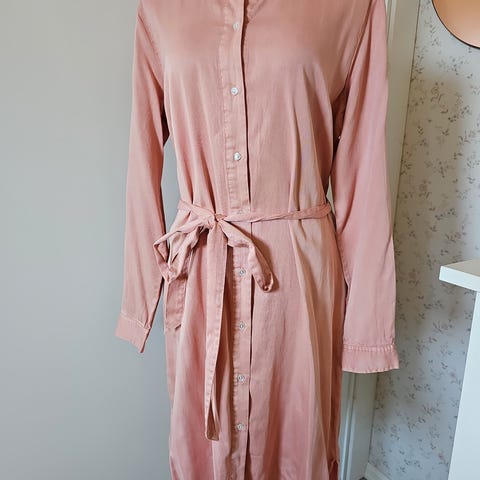 Klassisk svart skjortekjole fra Vila. Deilig viskosestoff som faller fint. Rekker meg som er 170 midt på leggen. Brukt en gang, men hempa man kan tre beltet gjennom er røket på ene sida, se bilde. Har ingenting å si for bruken, da beltet fint holder seg på plass uten.