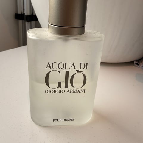 Giorgio Armani Gio parfyme i 50ml flaske. Er ens en del bruk igjen! Mistet lokket. Vintage parfyme som ikke produseres lenger