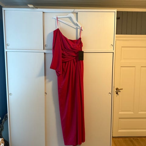Laget av polyester. Kjolen er rød og designet for kvinner. Den har et langt snitt med brede stropper og en formet overdel.