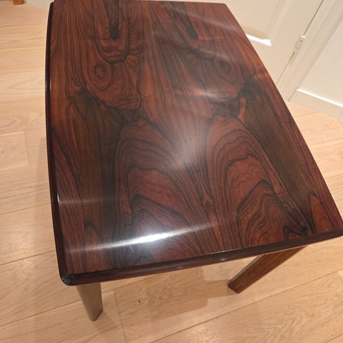 Bord fra Rasmus Solberg Cabinetmaker. Trolig fra tidlig 1970-tall. Lakkert. Valnøtt?