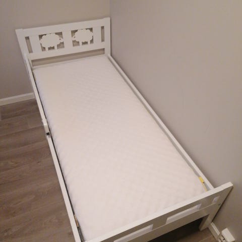 Spider-Man seng med oppbevaring gies bort. Størrelse: 140x70. Madrass følger ikke med. To oppbevaringsbokser under sengen. Materiale i mdf. Lite bruksmerke på ene siden, se bildet.