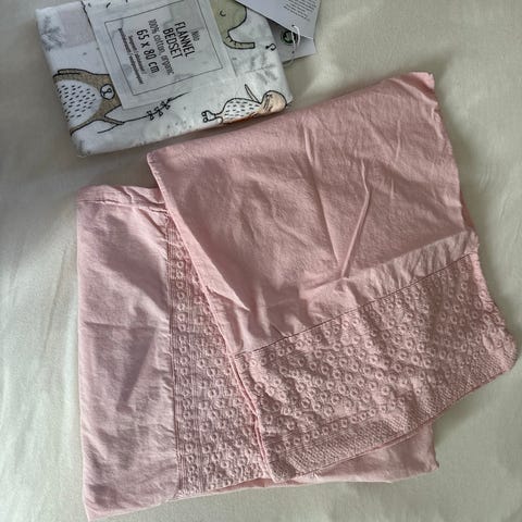 3 stk i bomull og 1 i flanell. På et av sengesettene er det brodert Prins. Putetrekk har aldri vært benyttet. Stretchlaken til babycrib kan følge med om ønskelig.