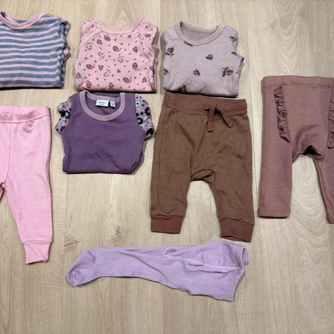 2 x Name It strømpebukser - Blanding av ull, bomull og polyamid. Str 62/68, men nærmere 62. Disse er mine personlige favoritter, da de er myke og ikke strammer rundt magen. Veldig praktisk med strømpebukser som innerste lag.