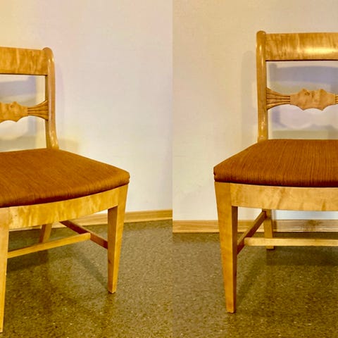 Nydelig gammel stoler. I meget god stand. 48 cm sitte høyde. Bredde 38 cm. Høyde hele stolen 85 cm. 950kr per stk. Veldig sjelden.