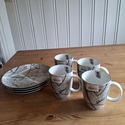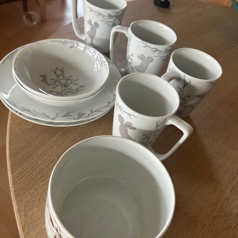2 middagstallerkener/fat, 11 asjetter, 8 kopp/skål, 6 krus, vase og 8 div boller.