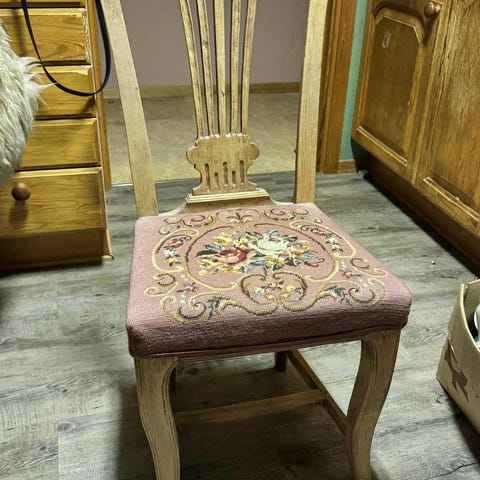 Antikke spisestuestoler i tre med dekorative ryggstøtter og polstrede seter