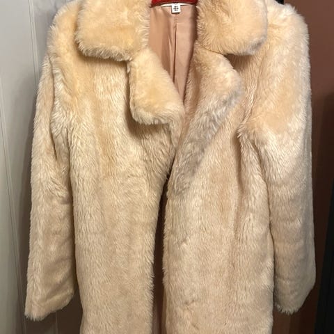 Faux Fur kåpe i størrelse S. Passer fint en S-M. Fargen er mørkebrun / sjokoladebrun og veldig god og varm. Jakken lukkes med to skjulte trykk-knapper. Skjulte lommer i sidene. Kun brukt 2 ganger. Selges kun da jeg har for mye i skapene.