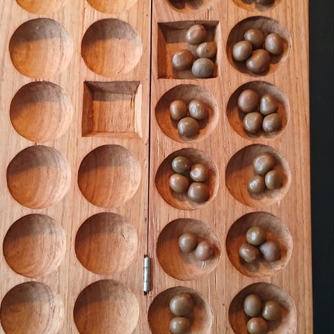 Tradisjonelt afrikansk strategispill. Brettspill i tre med utskårne runde fordypninger til kuler. Brettet har dekorasjon av en giraff på utsiden, og målene er 43x8x7 cm.