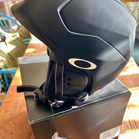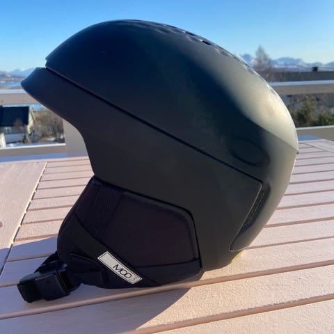 Oakley ski- og snowboardhjelm i hvit farge. Hjelmen har et enkelt og funksjonelt design, egnet for vintersportaktiviteter som ski og snowboard. Den inkluderer justerbar hakestropp for sikker passform.