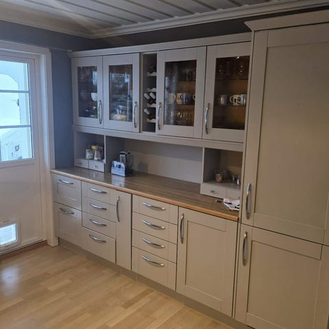 Komplett kjøkken med MYE skapplass og hvitevarer med mye bruk igjen. Et eldre kjøkken, med noe slitasje, men god funksjonalitet.