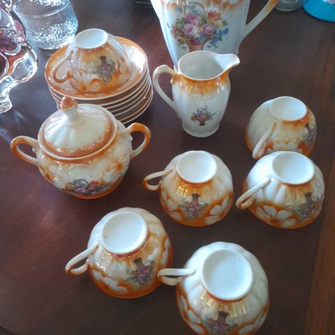 Settet er komplett for 8 personer, og inneholder: 8 asjetter for kaka /8 kopper /8 skåler Kaffekanne/ Fløte/sukker sett /1 Lysestaker/ 1 vase.