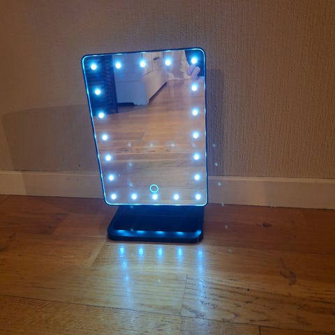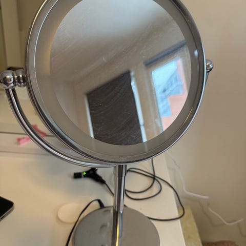 BYLYKO sminkespeil med LED-lys i rosa farge. Speilet har en rund form og innebygd belysning som gir jevn lysfordeling. Passer for bruk ved påføring av sminke eller ansiktspleie.