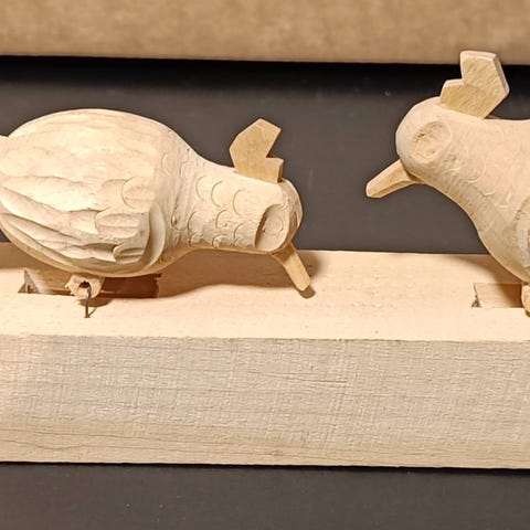 Mekanisk konstruksjon: Når håndtaket dreies, beveger hønene hodene som om de spiser. Grisen beveger seg også som om den spiser. Original hyssing er bevart, men har røket av alder.