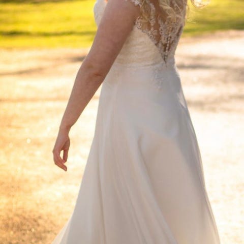 Har brukt ca 2000 kr hos skredder på å sy tyllet over skuldrene fast slik at det holder seg på samme sted gjennom hele dagen. Det er også sydd inn hemper på innsiden bak, slik at man kan tre bhen gjennom og den ikke sklir opp ila dagen.