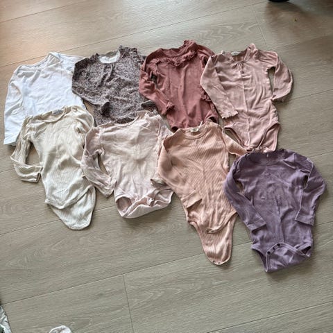 Nøytral klespakke til nyfødt. Strl 56. Heldress i 62, men liten i størrelsen. Inneholder ullsett, to ullbodyer, ull heldress fra hm, bomullsdress fra petit piao, bukse fra konges sløjd og en omglagsgenser.