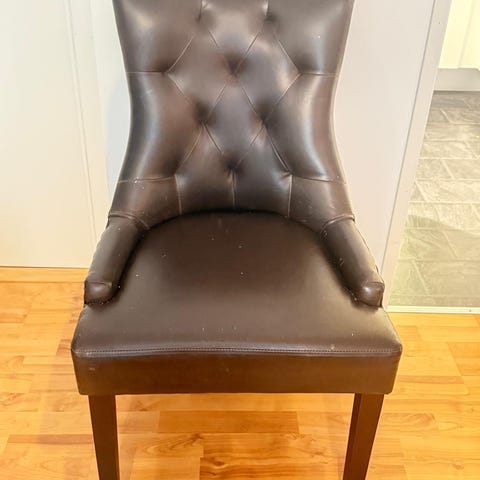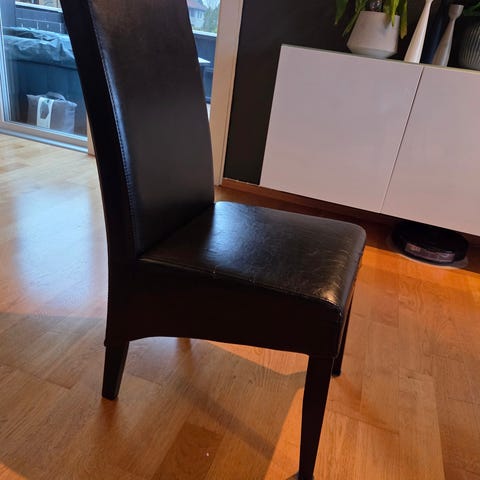 8 godt brukt spisestoler med dypblått fløyelstrekk. Noen rygger er løse og trenger å festes. Gis nort.