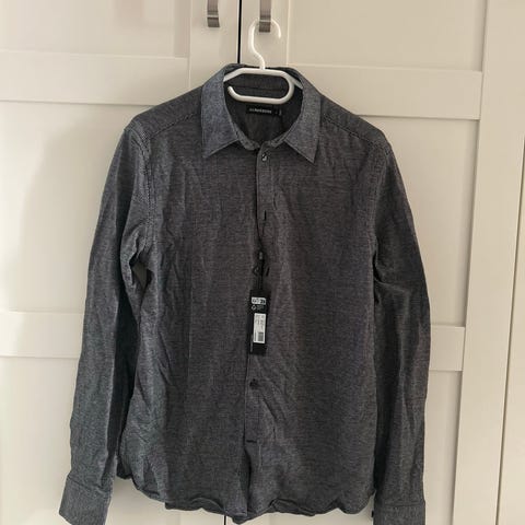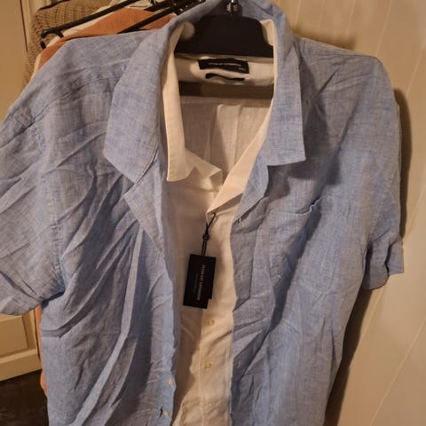 J. Lindeberg skjorte i blå farge, størrelse M. Laget av lyocell materiale. Kortermet design med flerfarget krage i rosa og grønt.