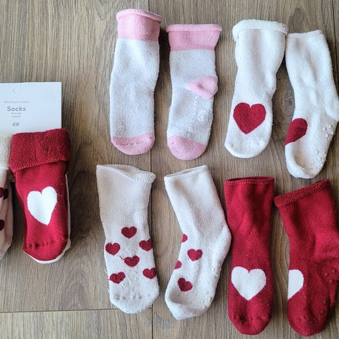 Bilde 1: Sokker med jordbærmotiv. Brukt fram til str 1 år her. Sitter godt på foten og har antiskli.