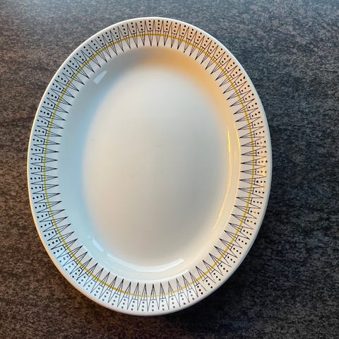 Trenger du et nytt stort serveringsfat til en samling rundt middagsbordet, har du sjansen nå. ikke bare er det et nydelig serveringsfat helt uten bruksmerker eller krakkelering, men et ekstra pluss er at det er produsert hos den norske Egersund fajansefabrikk.