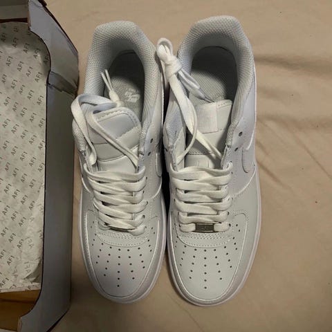 Kjempefine Nike Air Force 1 sneakers , hvite med lysblå detaljer selges da de ble for små. Str 42 1/2. kun prøvd en gang.