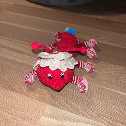Lots a Legggggs kosedyr/bamse med 12 bein. Gul med knallrød lue. Den er ca 43 cm lang.