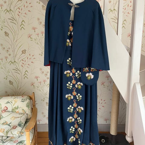 Festdrakt til jente 14 år. Det følger med et hvitt skjorte, en svart kappe, og en belte med en lite veske.