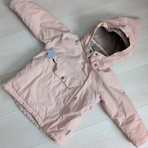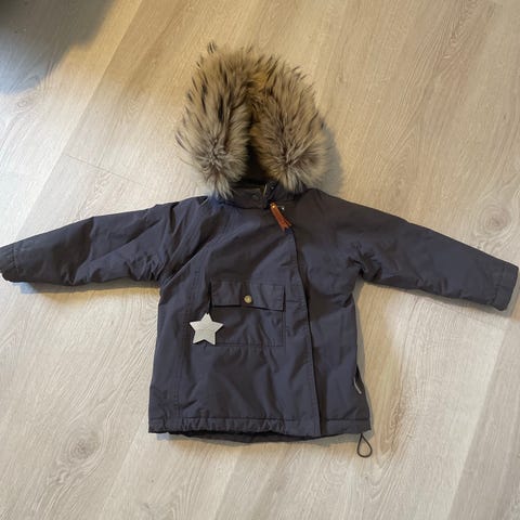 Vinterjakke str 104. Veldig søt jakke som fremstår som pen, men den ene enden av strikken inni er morken, og det er slitasje på knappene, se bilder. Trykknappene kan skjules når hetten er av. Ekte pels. MINI A TURE.