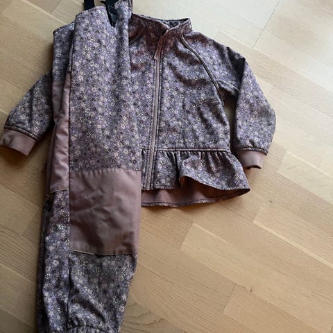 Settet består av en myk dongeri-bukse og en lilla genser, begge i god stand uten hull eller rifter.