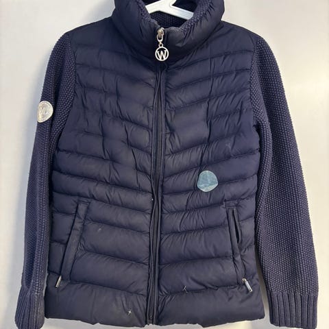 Jakke fra WoolLand. Dun (unntatt armene), veldig fin farge. Et lite hull som er sydd igjen, og trenger en vask.