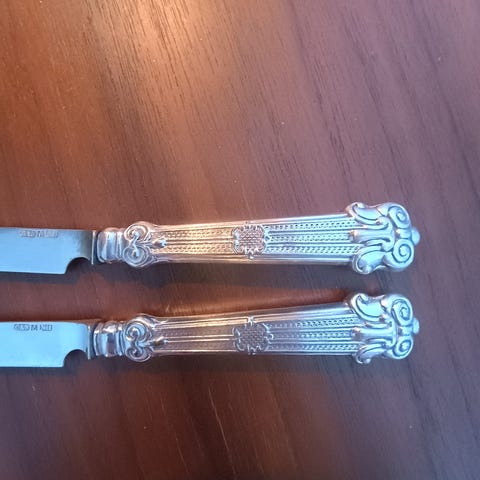 Den med perlemors håndtak blir i utlandet ofte solgt som en kake kniv for bryllup. Har en del venner i England og de fortalte at de solgte de for mellom 400 og opp til 800 kr for en.