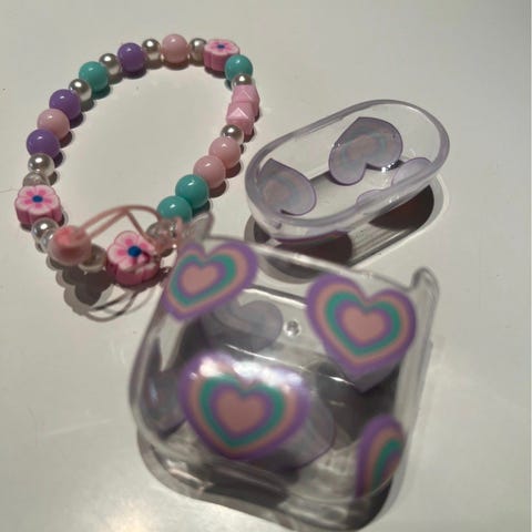 Primark AirPods deksel med hjerteprint og dekorative perler. Passer til AirPods 1 og 2. Gjennomsiktig materiale med lilla og rosa hjerter og perler i matchende farger.