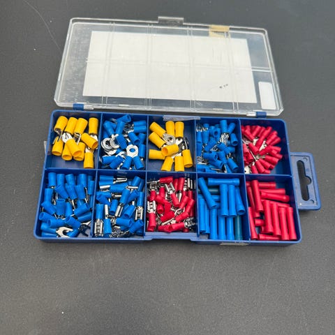 Elektriske tilkoblingsdeler assortert. kabelsko / crimp-terminaler. rød/blå/gul