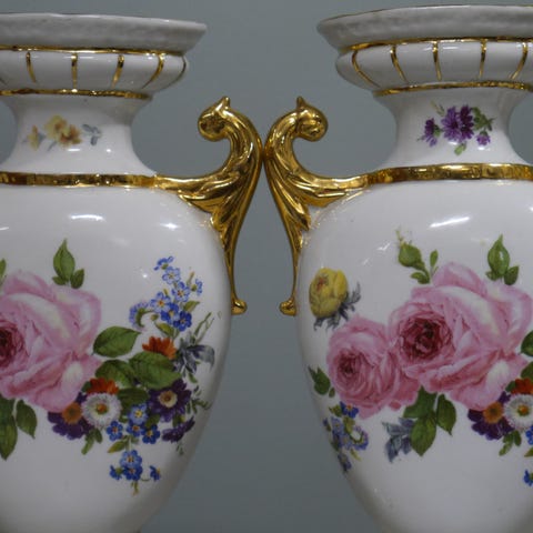 Fatet er håndmalt med floralt motiv: hvite blomster, gullblader og sorte detaljer. Bakgrunnen har en elegant grønn farge med gradient fra mørkt til lyst mot midten. Gullrelieffet er laget med 24 karat gull.