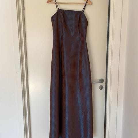 Vakker ballkjole str 42 i nydeleg lavendelblå farge og med fine detaljar både rundt utringinga framme, ved glidelåsen bak og på armane. Fint brukt, ingen slitasje.