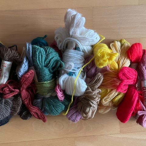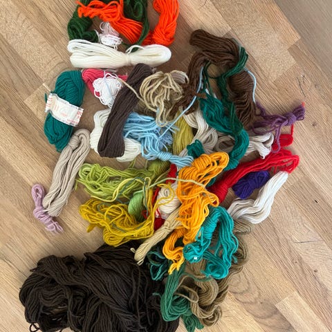 115 gram Guro ull broderigarn og 30 gram Anchor ull broderigarn. Litt av hvert. Selges samlet for kr. 220,- + frakt