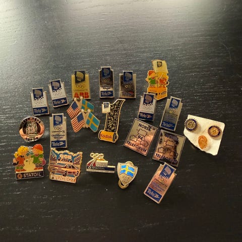 Diverse pins og emblemer assortert
