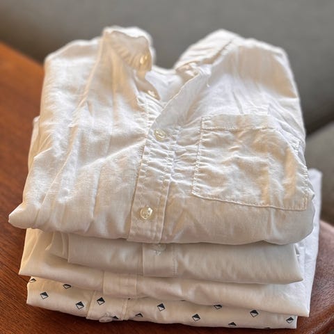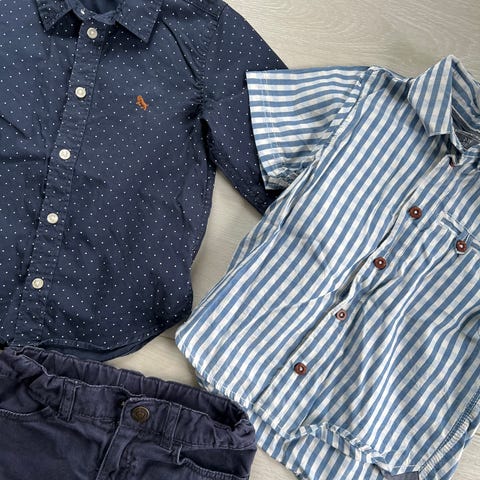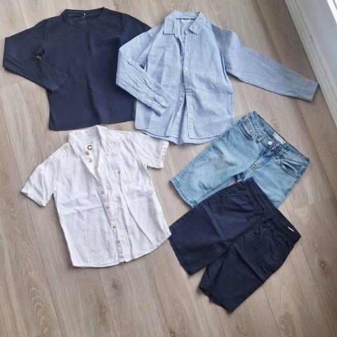 Alle klærne ser ubrukt ut, og er pent å lite brukt av et barn. De to skjortene og den mørke blå shortsen er i en lin og bomulls blanding.