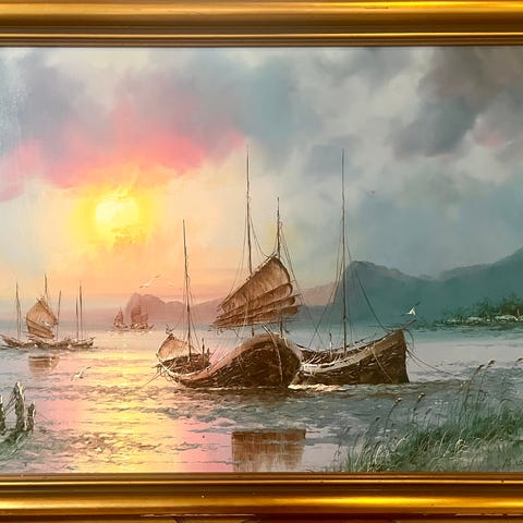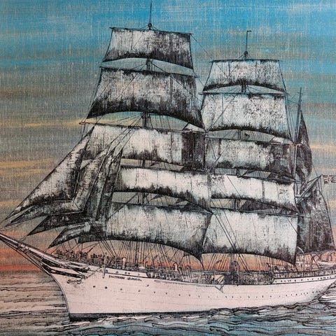 Maleri som forestiller et stort seilskip på urolig hav med høye bølger og dramatisk himmel. I bakgrunnen skimtes en kystlinje med fyrtårn. Bildet er signert nede i høyre hjørne. Maleriet er montert i en profilert, mørk ramme med dekorative detaljer. Egner seg som veggbilde i stue, gang eller kontor, spesielt for dem som liker maritime motiver og klassiske seilskipsscener.