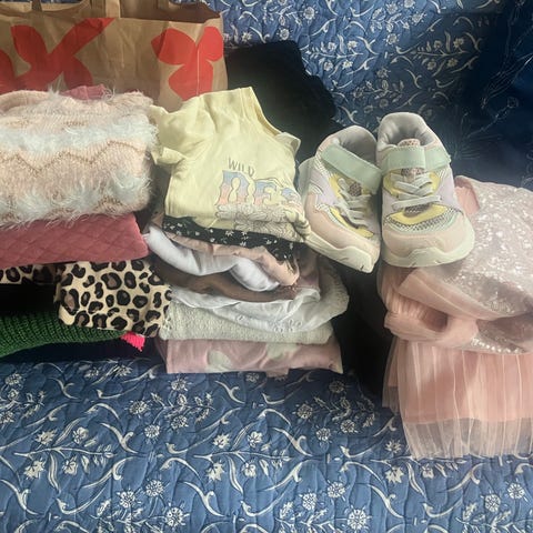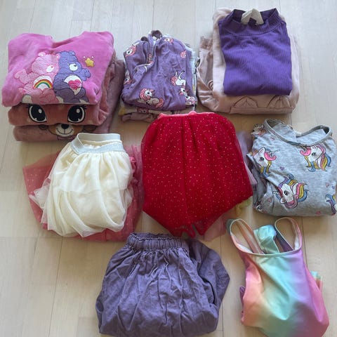 Om man ønsker kan man få med 2 strømpebukser, 3 bukser og en sommerkjole som det er noen flekker på(se siste bilde). Ellers er tøyet helt og rent.